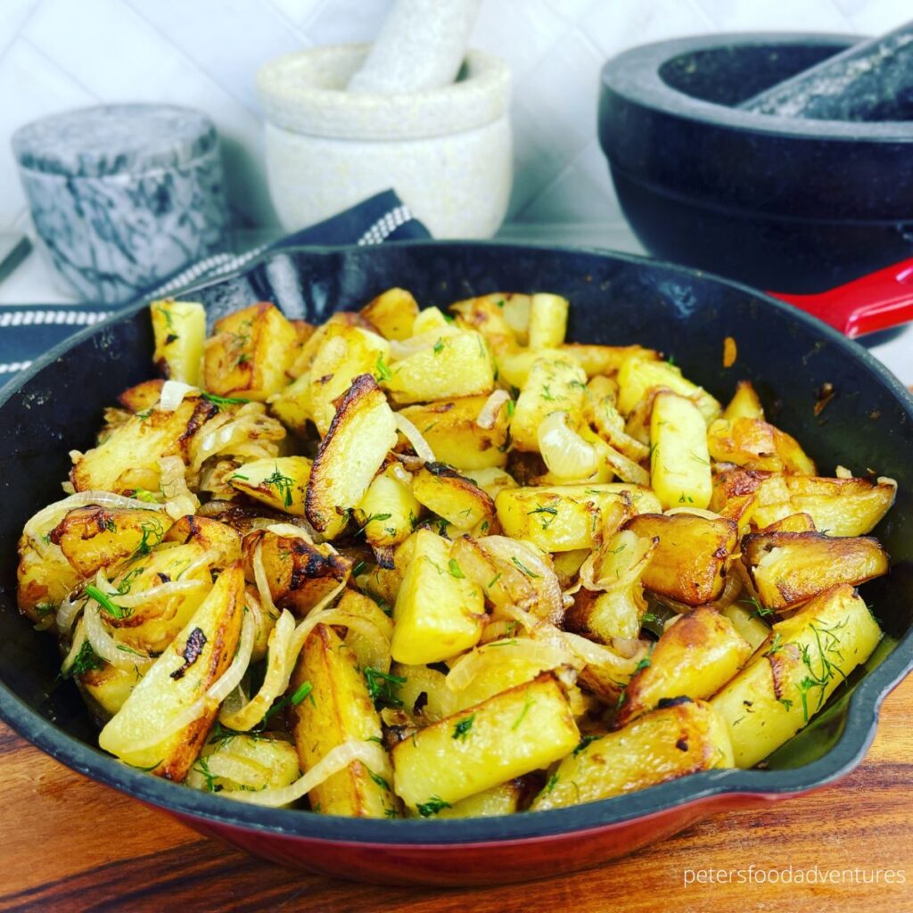 Ingredients: 4 russets (diced), 1 onion (sliced), 3 tbsp butter, salt/pepper, paprika.