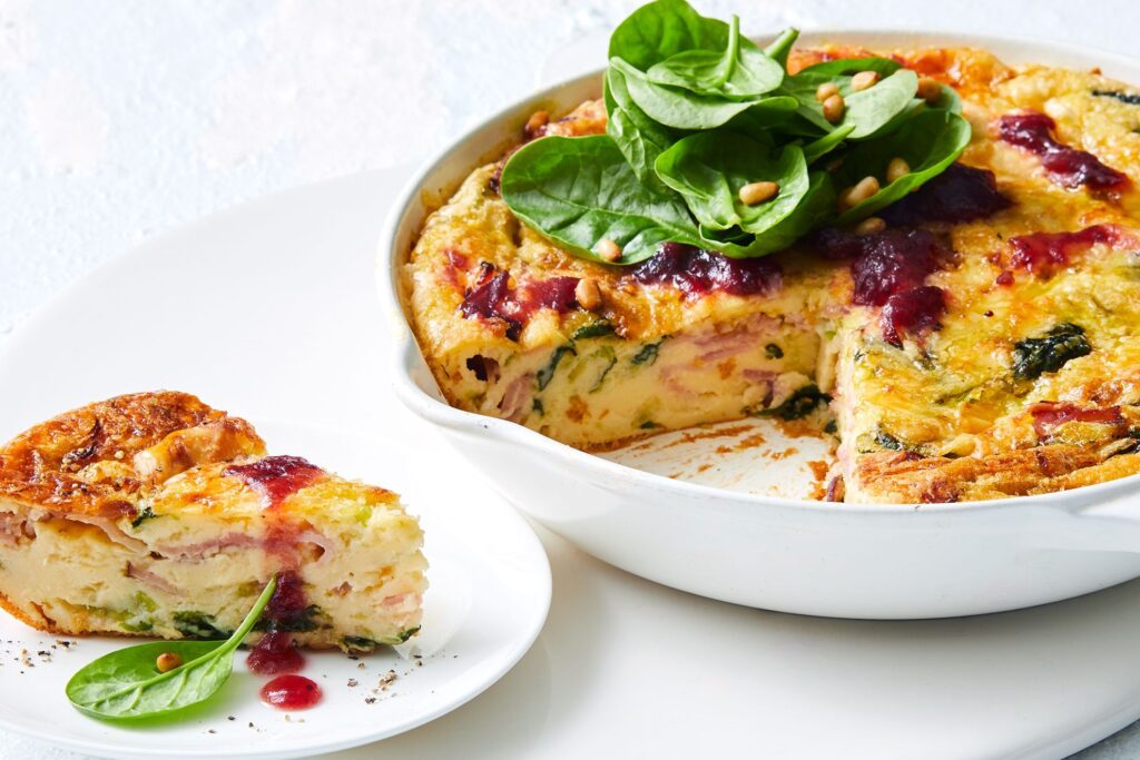 Classic and comforting, incorporate diced ham (8 oz) and Swiss cheese. It’s like a upgraded ham sandwich in pie form – ideal for holidays.
