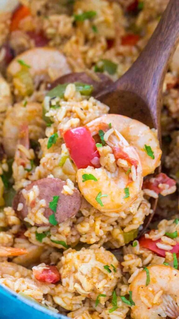 Tips: For seafood jambalaya, skip chicken and double shrimp. Make it milder with turkey sausage. Pairs with cornbread—see our cornbread recipe. Nutrition per serving: 550 calories, 28g protein.